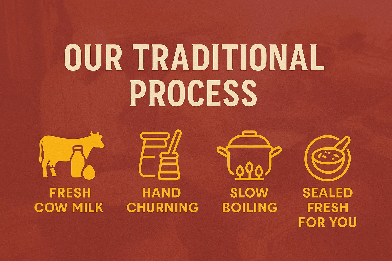 At the heart of our brand lies a time-honored method — a process that celebrates purity, patience, and tradition. From collecting fresh cow milk every morning to hand churning it with care, we ensure every step preserves authentic taste.