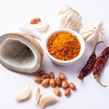 Dry coconut, Roasted peanuts, Garlic, Red chilies, Sesame seeds, Salt, and a touch of oil.